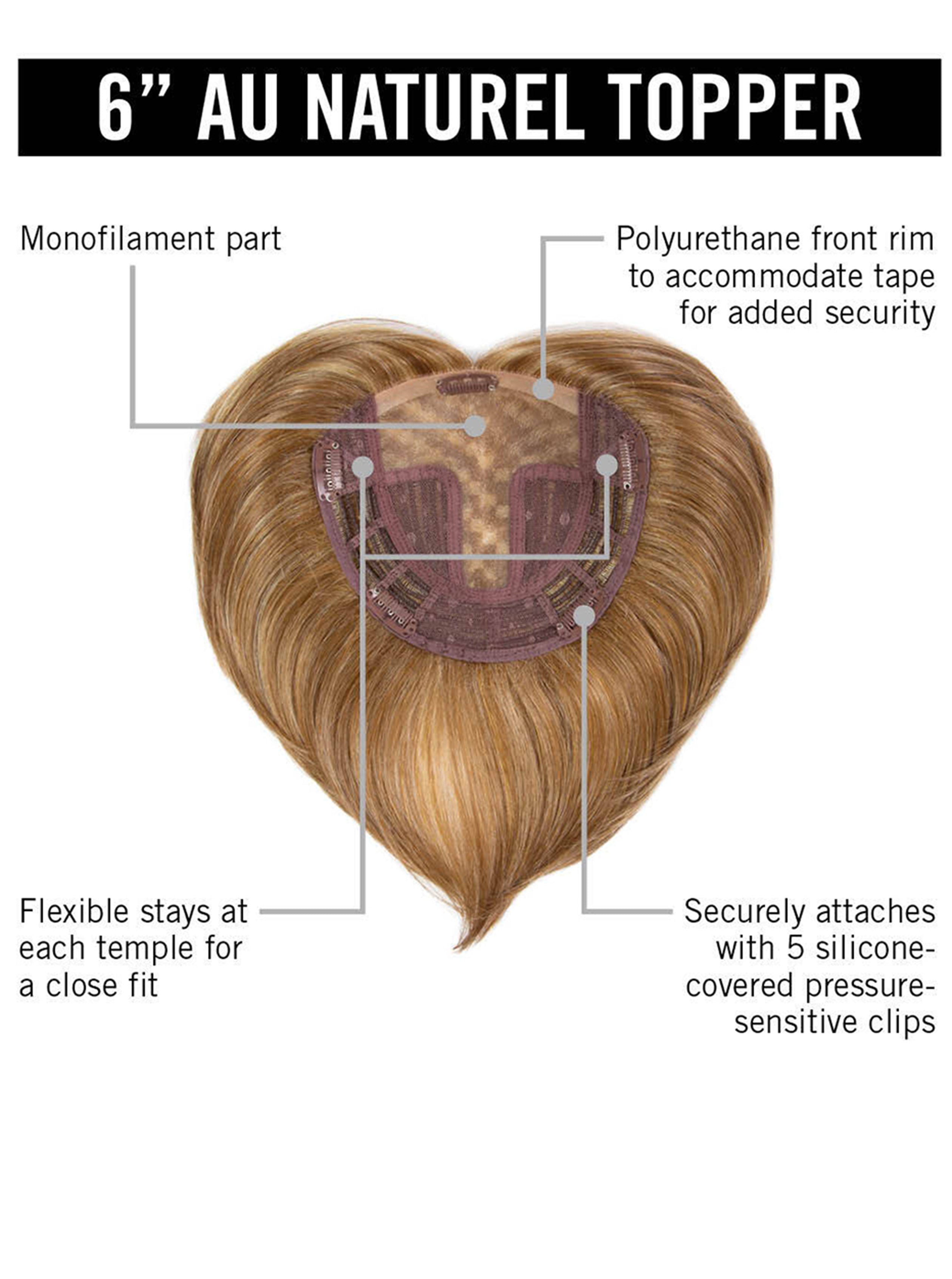 The 6″ Au Naturel Topper from Hairdo is a lightweight clip-in hair topper designed for women experiencing thinning or hair loss at the crown, offering natural-looking coverage that blends seamlessly with shorter hairstyles. Featuring a breathable 6″ x 6¾″ base for comfortable, all-day wear, this crown hair topper provides instant volume with a barely-there feel. Made with Tru2Life® heat-friendly synthetic hair, it can be flat-ironed, curled, or blow-dried to match your desired style. With 6¼″ length at the front and crown and 6″ on the sides and back, this 6 inch hair topper delivers effortless, natural enhancement and confidence in minutes.
